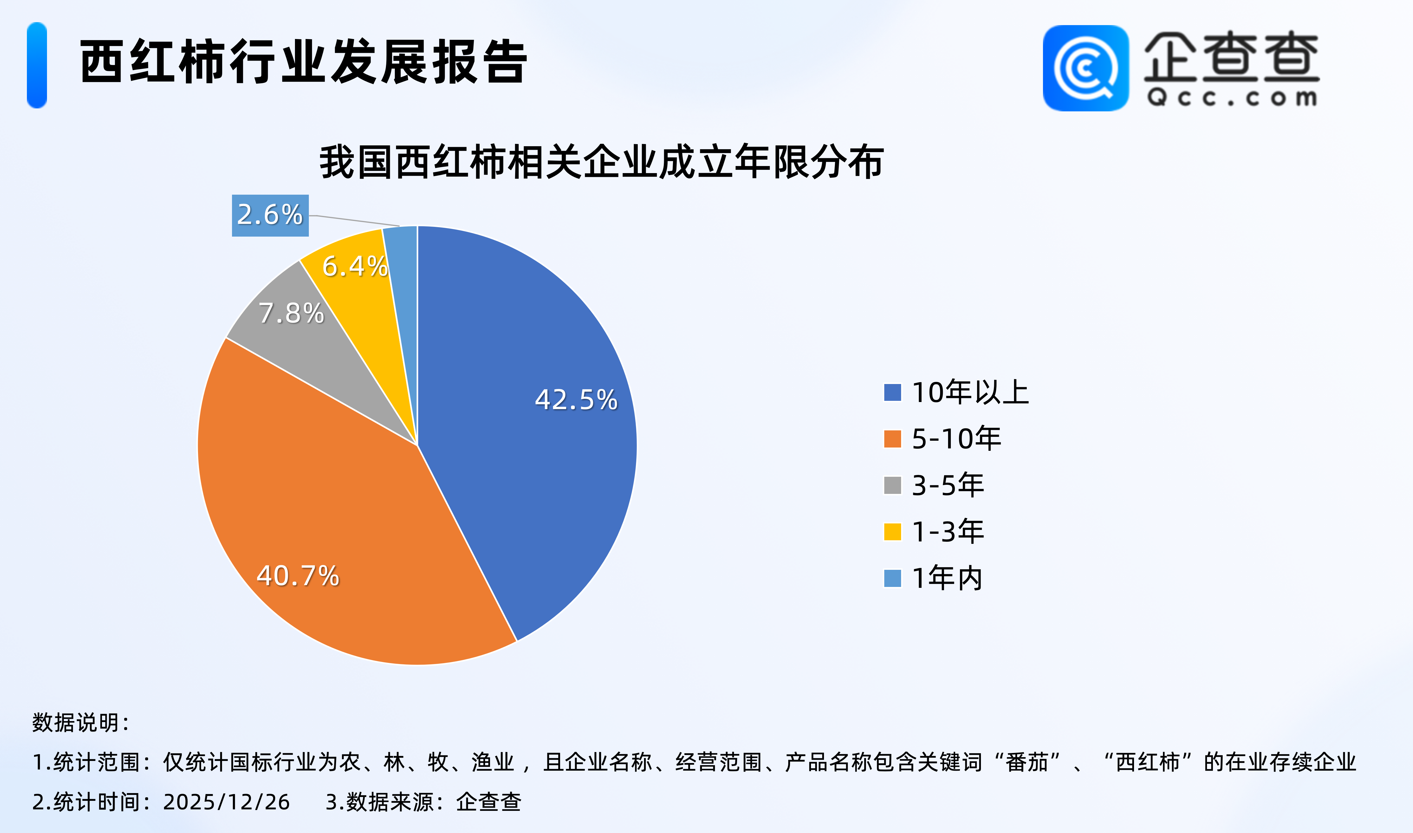 企查查数据显示,截至12月26日,我国现存2795家西红柿相关企业,区域分布上,我国华东地区现存西红柿相关企业最多,占比35.7%,其次是华北地区,占比27.7%,东北地区西红柿相关企业存量相对最少,占比3.0%。2.从成立年限来看:成立超10年的企业占比42.5%